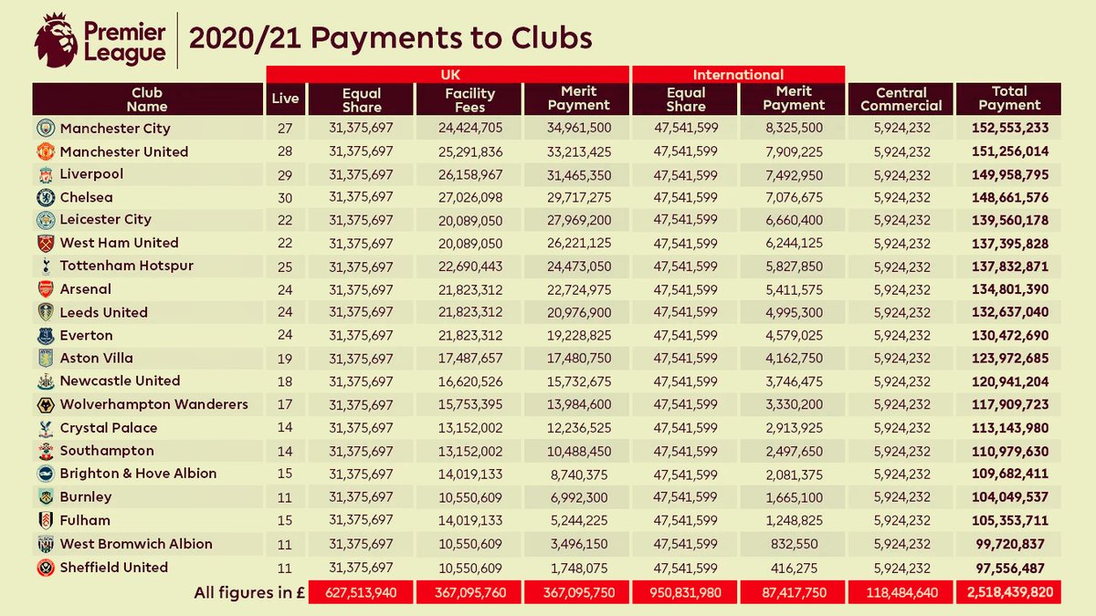 أي أن معظم عائدات البث الدولية توزع بالتساوي على جميع الأندية ، و أي زيادة عن مستويات الدخل المسجلة موسم 2018-2019 يتم توزيعه حسب ترتيب الأندية