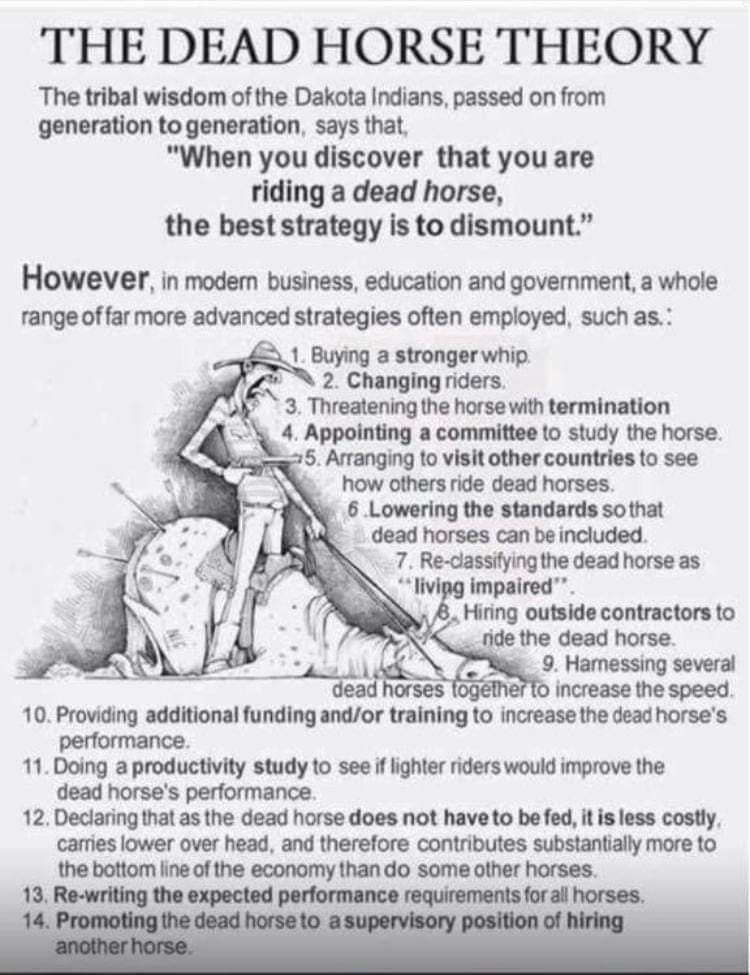 *"نظرية الحصان الميت" أساسًا هي حكمة لقبلية "داكوتا" من قبائل الهنود الحمر، عاشوا بامريكا الشمالية وكانت هذه الحكمة تنتقل من جيل إلى جيل*