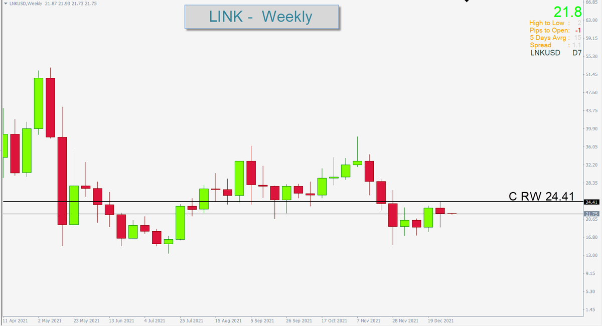 عملة LINK :: الاتجاه العام هابط ( لذلك يمنع الشراء إلا اذا تحقق شرط الإغلاق الإيجابي اعلى المقاومة المركزية الاسبوعية 24.41 ) مع تفعيل وقف الخسارة .. عدا ذلك لا تغامر بالشراء مالم يتحقق هذا الشرط كون الاتجاه ذاهب للهبوط .