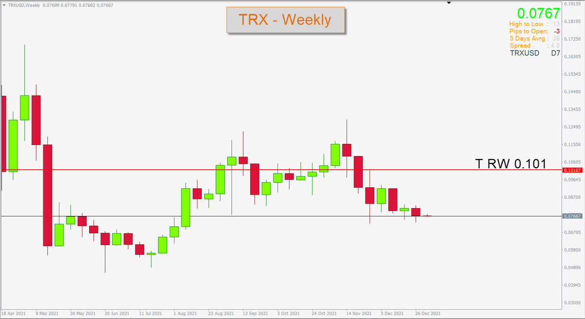 عملة TRX :: الاتجاه العام هابط ( كون المقاومة التقليدية الاسبوعية 0.101 تسيطر على الاتجاه ) وبتالي يُمنع الشراء تحت هذه المقاومة .. اذا تحقق شرط الاغلاق الايجابي اعلى المقاومة حينها يمكن الشراء مع تفعيل وقف الخسارة