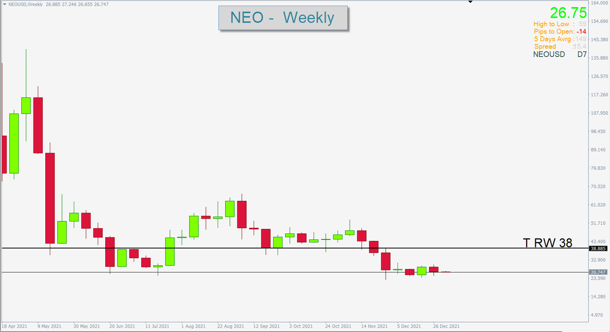 عملة NEO :: الاتجاه العام هابط ( كون المقاومة التقليدية الاسبوعية 38 تسيطر على الاتجاه ) وبتالي يُمنع الشراء تحت هذه المقاومة اذا تحقق شرط الاغلاق الايجابي اعلى المقاومة حينها يمكن الشراء مع تفعيل وقف الخسارة