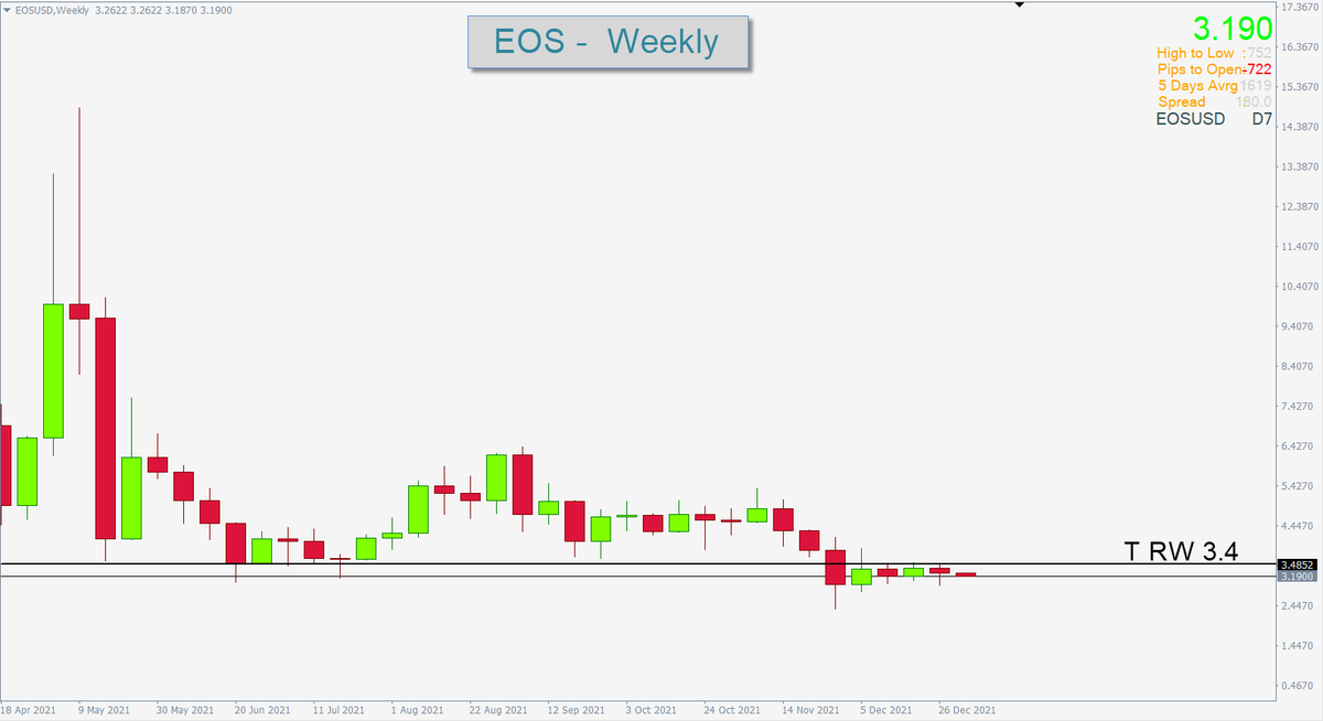 عملة EOS :: الاتجاه العام هابط ( كون المقاومة التقليدية الاسبوعية 3.4 تسيطر على الاتجاه ) وبتالي يُمنع الشراء تحت هذه المقاومة اذا تحقق شرط الاغلاق الايجابي اعلى المقاومة حينها يمكن الشراء مع تفعيل وقف الخسارة عدا ذلك لاتغامر بشراء