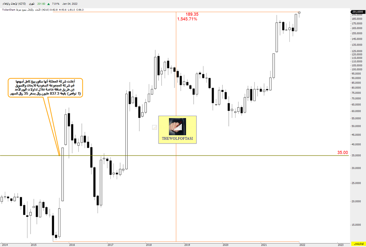 مع فقرتنا المعتادة #قصة_سهم من سوق الأسهم السعودي #تاسي مع سهم شركة #الابحاث_والاعلام اليوم السهم يسجل أعلى تاريخي عند مستوى الـ 202 ريال..