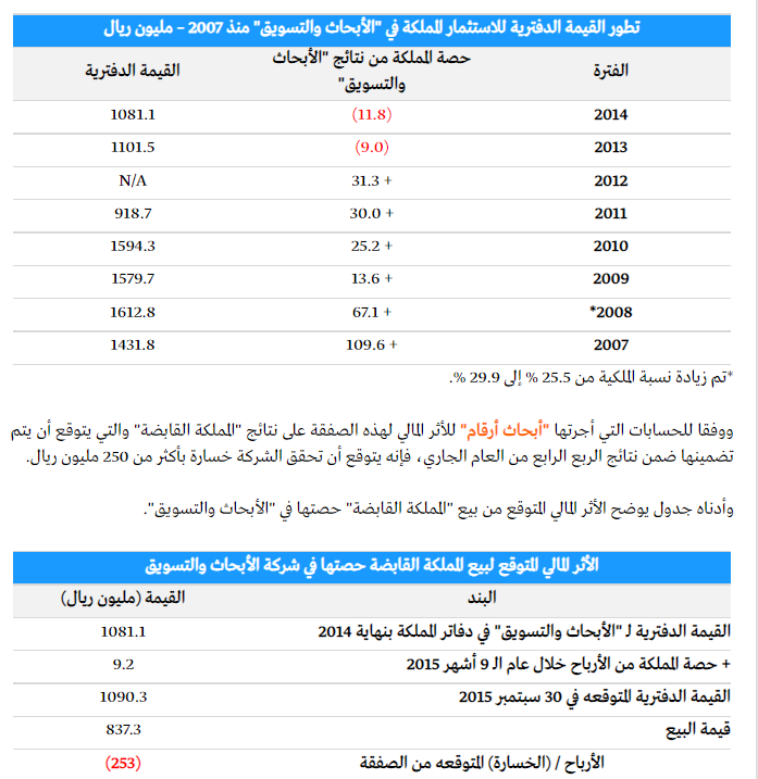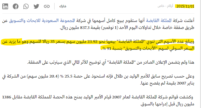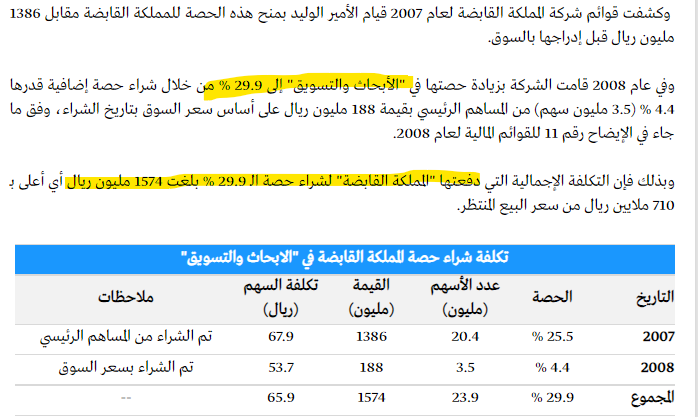 كانت شركة #المملكة_القابضة تمتلك في أسهم شركة الأبحاث ما نسبته 29.9% أي ما يعادل 23.9 مليون سهم بتكلفة اجمالية بلغت 1,574 مليون ريال