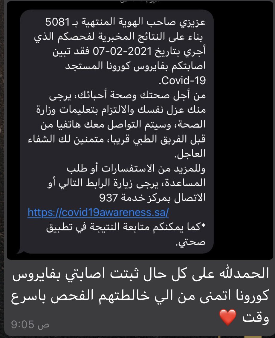 ومرت اليومين هذي طبيعي وكان الشخص المخالط راكب جنبي طول الطريق 😍 ، وكنا 4 في السيارة والمخالط راكب ورا بالنص 😂 يعني موقع استراتيجي وصلنا للرياض ومن التعب نمت عشان عندي دراسه بكرا كالعاده 🤷🏻♂️ ، قمت عشان أصلي الفجر وفتحت جوالي بشوف كم الساعة وهنا كانت الصدمه 🙂💔