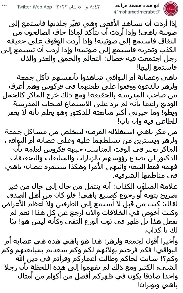 علامة المتلوّن الكذاب: أنه ينتقل من حال إلى حال من غير تصريح بتوبة أو رجوع كصنيع باهي! فلو كان من أهل الصدق لقال: كنت من قبل لا أستمع إلى الطرفين ولا أعظم الأعراض وكنت أخوض في الخلافات والآن أرجع عن كل هذا! نعم لم يفعل هذا بل ظهر في ثوب الورع التقي وكأنه ليس هو! تبّا لك يا كذاب.