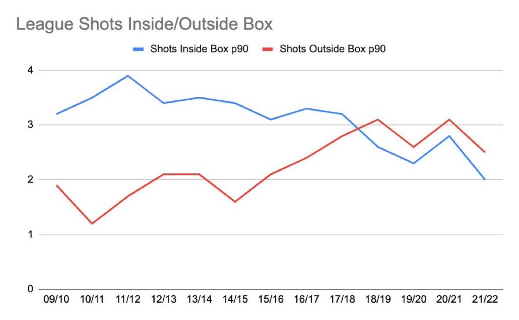 نتيجة لذلك انخفض عدد تسديداته من داخل منطقة الجزاء لكل 90 إلى أقل من 3 في الدوري في كل من المواسم الأربعة الأخيرة (بما في ذلك 21/22). في تلك المواسم الأربعة قام أيضًا بتسديد المزيد من التسديدات لكل 90 خارج منطقة الجزاء مقارنة بالداخل