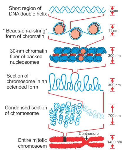 وذلك لأنها تكون على هيئة خيط رفيع وطويل تشبه الهياكل وتدعى الكروماتين . الكروماتين تكون طويلة و مثل الهياكل ، وهي مكونة من مزيج من الحمض النووي والبروتينات هيستون ، أثناء انقسام الخلية تصير أقل طولاً وأكثر سُمكاً وتدعى وقتها الكروموسومات .