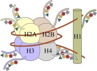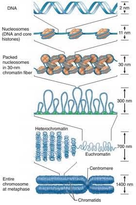 يتكون الكروماتين من الحمض النووي والهستونات في ألياف رفيعة ، ألياف الكروماتين يمكن العثور عليها إما في شكل مضغوط (هيدروكروماتين) أو أصغر (كروماتين)