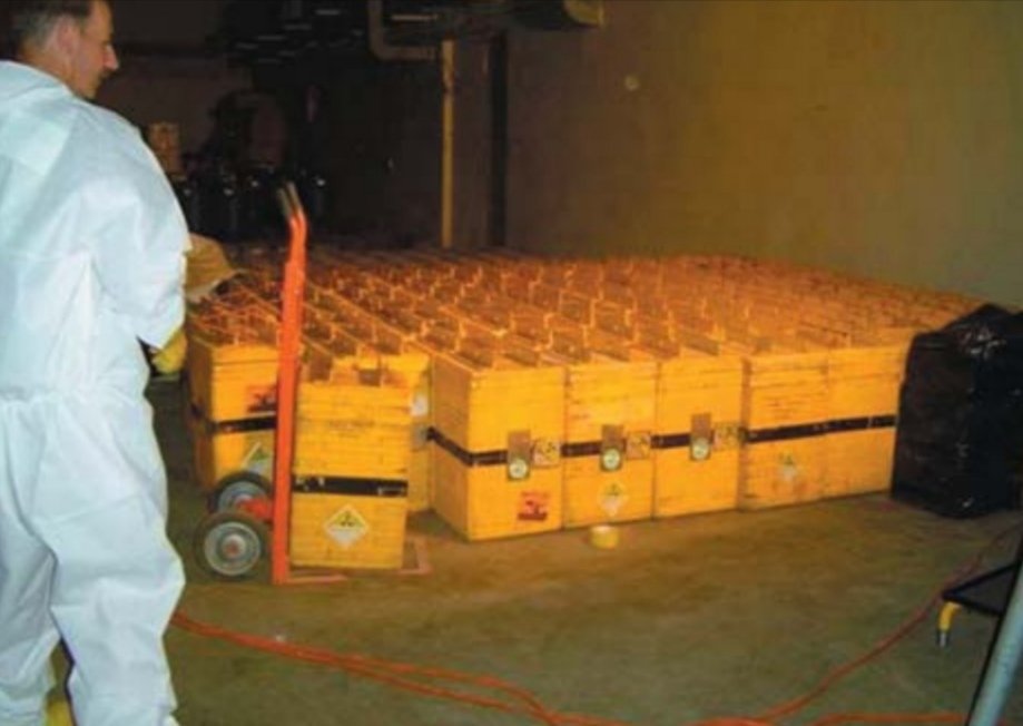 بكمية(550طن)داخل3500برميل تم بيعه الى شركة(Cameco)الكندية(ونقلتها الشركة الى كندا بعدهاب5سنوات)ومابقى من الخزين(اي250طن)سرقه الاهالي وادخلوه لبيوتهم ولحياتهم اليومية(وهو يورانيوم)