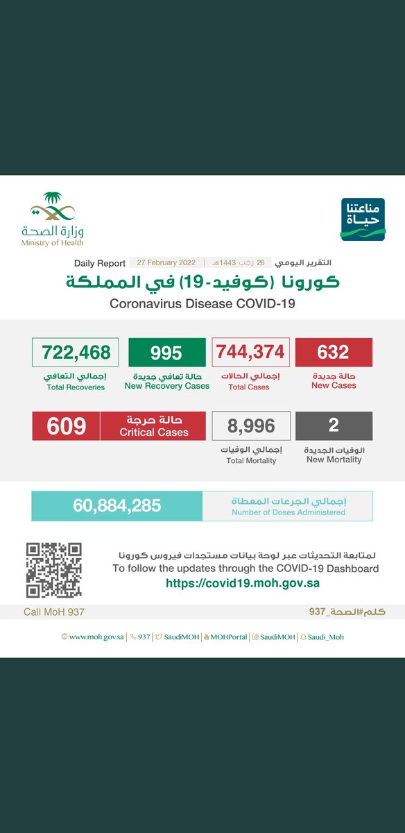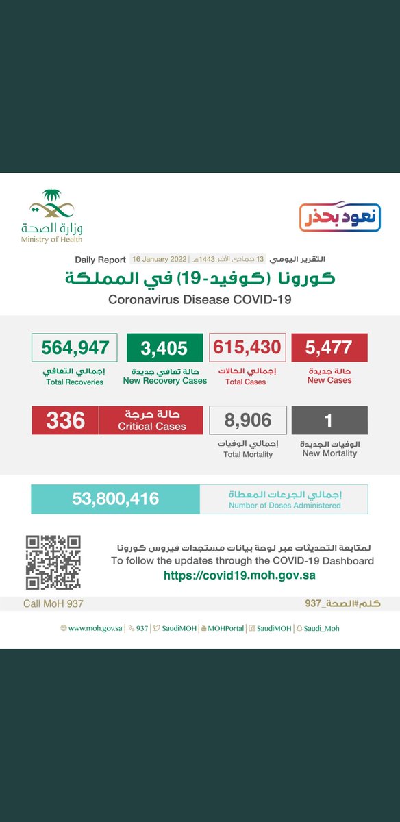 #وزارة_الصحة_السعودية تعلن الحالات الجديدة لفيروس #كورونا_الجديد (#كوفيد_19 ) المسجله ليوم الخميس 1 /1443/12هـ