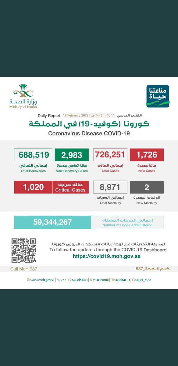 #وزارة_الصحة_السعودية تعلن الحالات الجديدة لفيروس #كورونا_الجديد (#كوفيد_19 ) المسجله ليوم السبت 12 /1443/11هـ