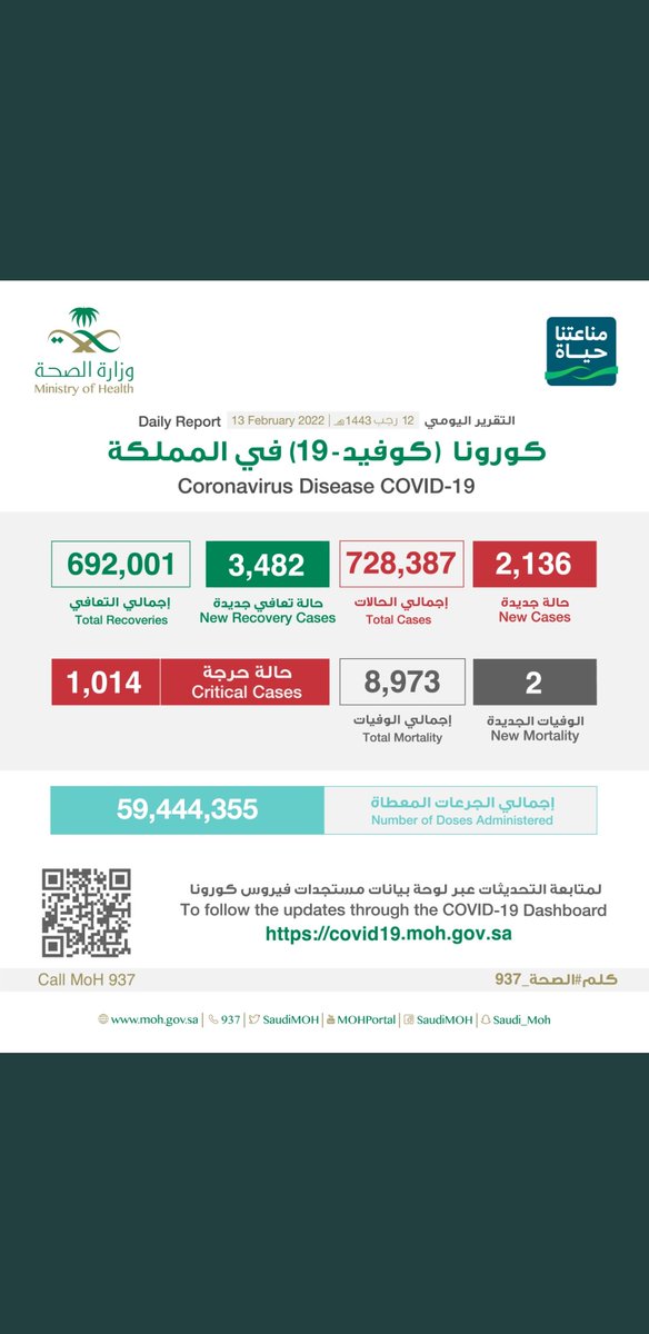 #وزارة_الصحة_السعودية تعلن الحالات الجديدة لفيروس #كورونا_الجديد (#كوفيد_19 ) المسجله ليوم السبت 12 /1443/6هـ