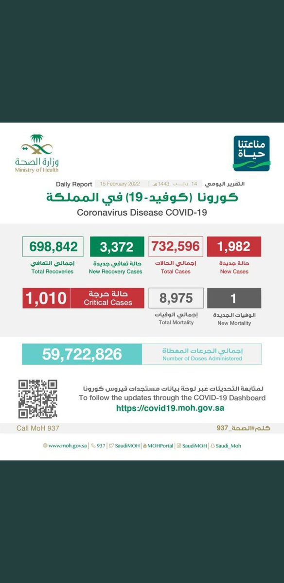 #وزارة_الصحة_السعودية تعلن الحالات الجديدة لفيروس #كورونا_الجديد (#كوفيد_19 ) المسجله ليوم الثلاثاء 15 /1443/11هـ