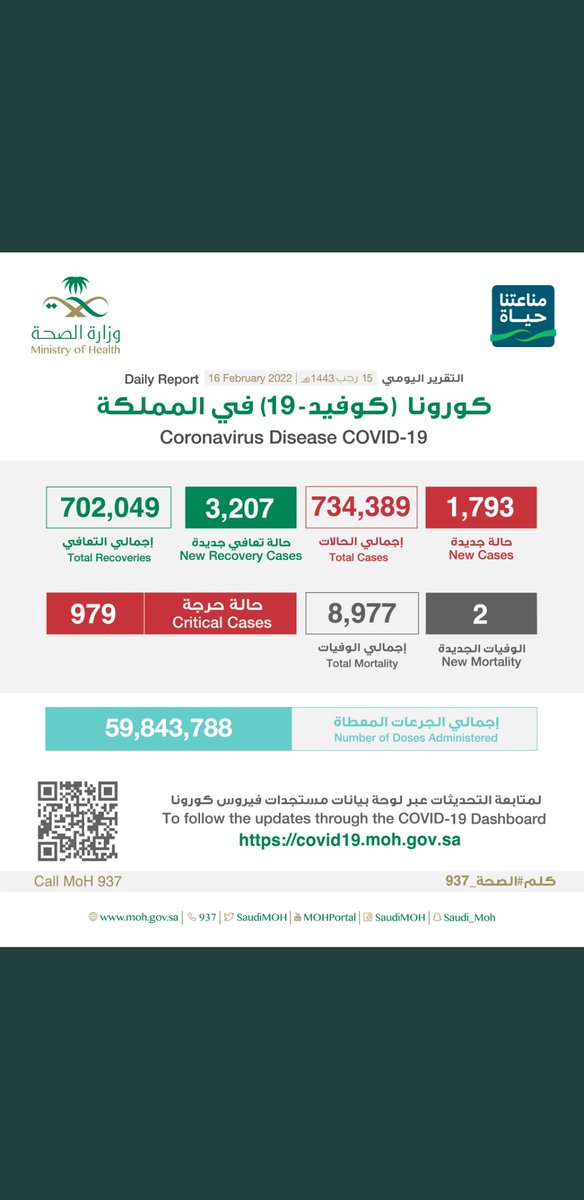 #وزارة_الصحة_السعودية تعلن الحالات الجديدة لفيروس #كورونا_الجديد (#كوفيد_19 ) المسجله ليوم الاربعاء 16 /1443/6هـ