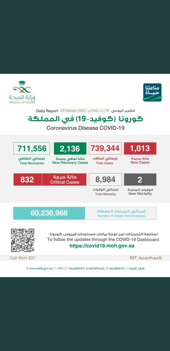#وزارة_الصحة_السعودية تعلن الحالات الجديدة لفيروس #كورونا_الجديد (#كوفيد_19 ) المسجله ليوم الاحد 20 /1443/11هـ