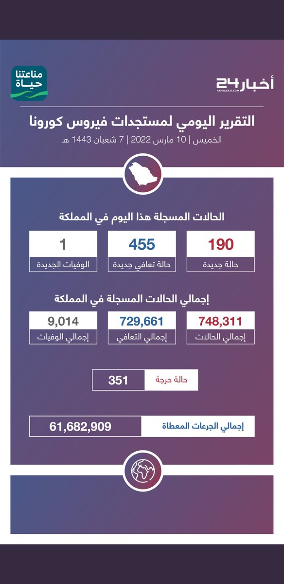 #وزارة_الصحة_السعودية تعلن الحالات الجديدة لفيروس #كورونا_الجديد (#كوفيد_19 ) المسجله ليوم الخميس 24 /1443/6هـ