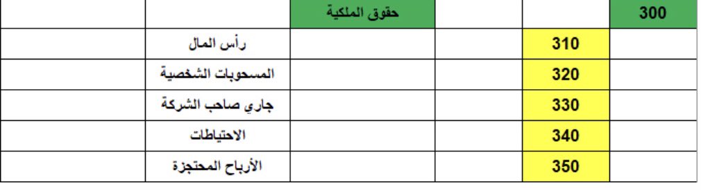 حقوق الملكية : يأخد الرقم 300 وتأخذ الحسابات المتفرعة من هذا الحساب الرئيسي الأرقام من 301 إلى 399