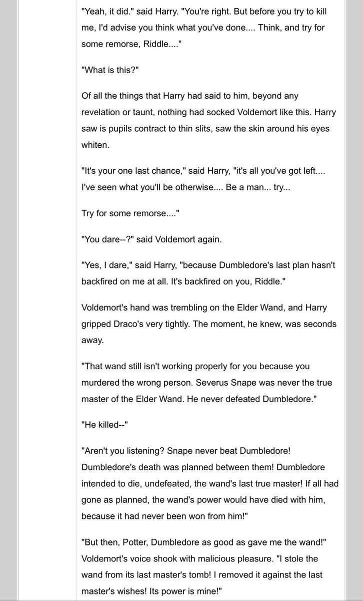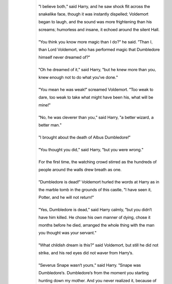 في نقاش دمبلدور مع ڤولدمورت برضو بيكتشف انه بيكلم تعابين وده كان اول ريد فلاج ثانياً شاف في كلامه سنة ملحسة وقدرة رهيبة على انه يلبسك العمة