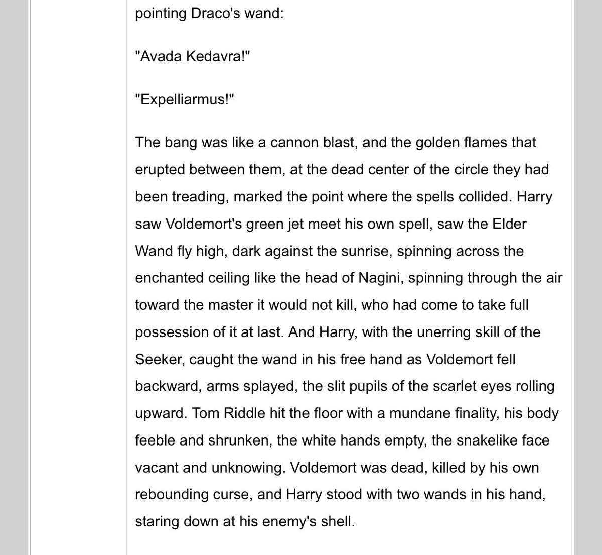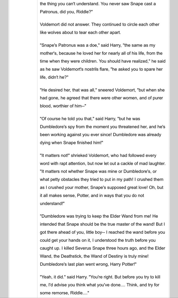 دماغه راحت للي قتل دمبلدور. وخلي بالك هنا من ان مرة تانية نظرة ڤولدمورت للموت على انه هزيمة بتقضي عليه، ڤولدمورت قالك سنيب قتل دمبلدور يبقى هو اللي كسبه فراح قاتل سنيب وقالك بس العصاية كدة بقت بتاعتي