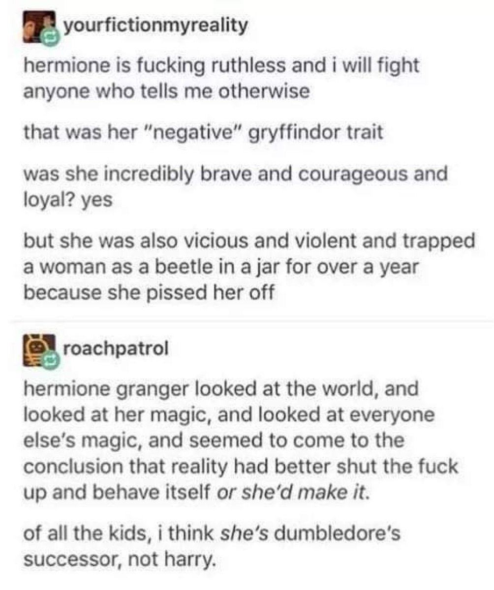 الا انها اكتر واحدة في الكتاب بتكسر القوانين. هيرمويني زيها زي دمبلدور بيحترموا القوانين لما تطبق على الناس مش عليهم لإن إمكانياتهم تسمح لهم ياخدوا شورتكاتس. هم عارفين ان ده لو اتعمم على العالم العالم هيخرب بس هم مش هيتنازلوا عن الحق ده لنفسهم بحثاً عن "المصلحة العامة"