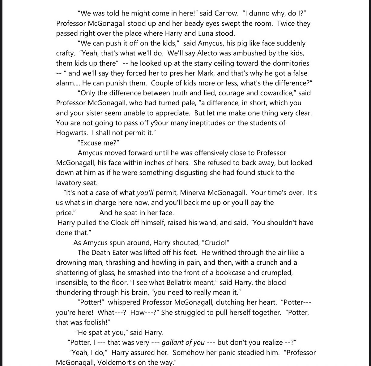 مش عايز اخش في تفاصيل اوي عشان مكنوجال واحدة من الناس القليلة اللي الأفلام ادتها حقها والممثلة كانت اكتر من عظيمة بس عايز اجيب حتة عظيمة من الكتاب في الجزء السابع أول ما هاري دخل المدرسة. الحتة دي كانت عظيمة في الفيلم بس خلينا نشوفها في الكتاب