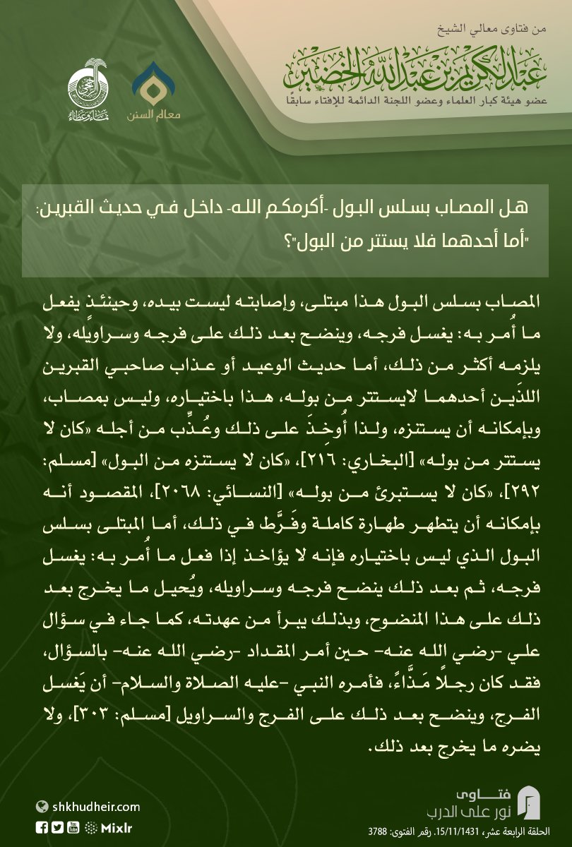 هل المصاب بسلس البول -أكرمكم الله- داخل في حديث القبرين: "أما أحدهما فلا يستتر من البول"؟