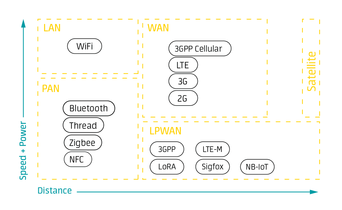 There are different types of network solutions based on their power consumption, range and bandwidth consumption.