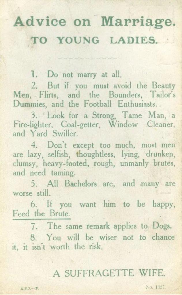 منشور كان يتم تداوله بين أعضاء الحركة النسوية قبل ١٠٠ سنة، فيه ٨ نصائح تتعلق بالزواج موجهة للشابات: