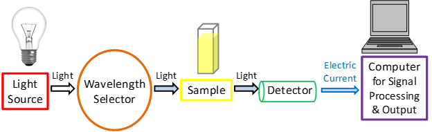 ويبدأ التحليل بانطلاق الضوء من المصباح (Light Source)، ثم تنقية وتركيز الضوء والتحكم بنوعية الضوء من خلال ادوات مسار الضوء (Light path)، (الهدف من مسار الضوء هو معالجة الضوء بهدف إيصال النوع المراد من الضوء الى العينة) ثم مرور الضوء من خلال العينة الى الكاشف او المقدر Detector.