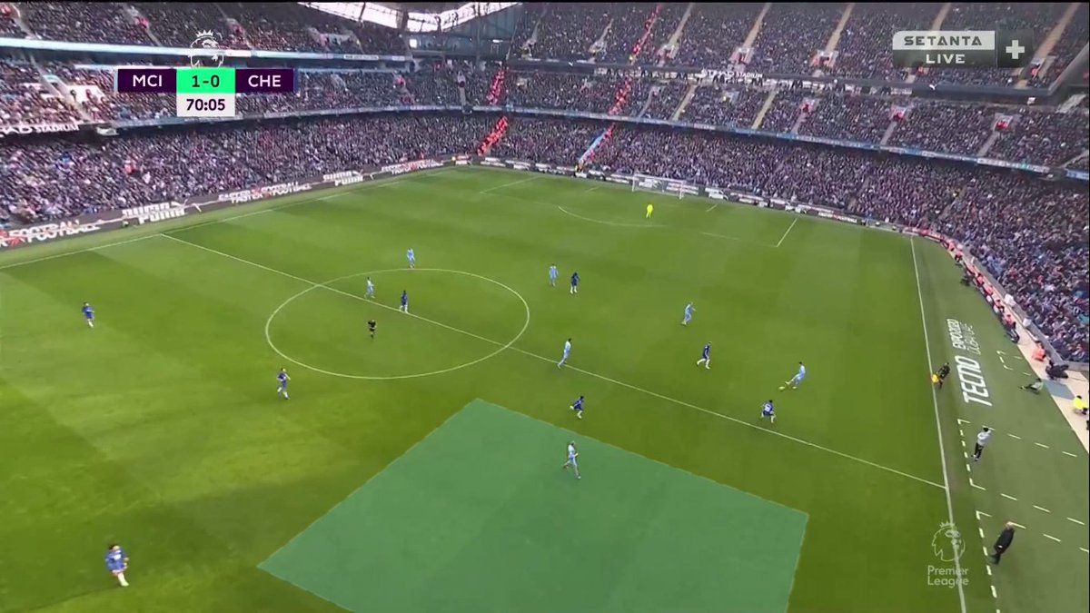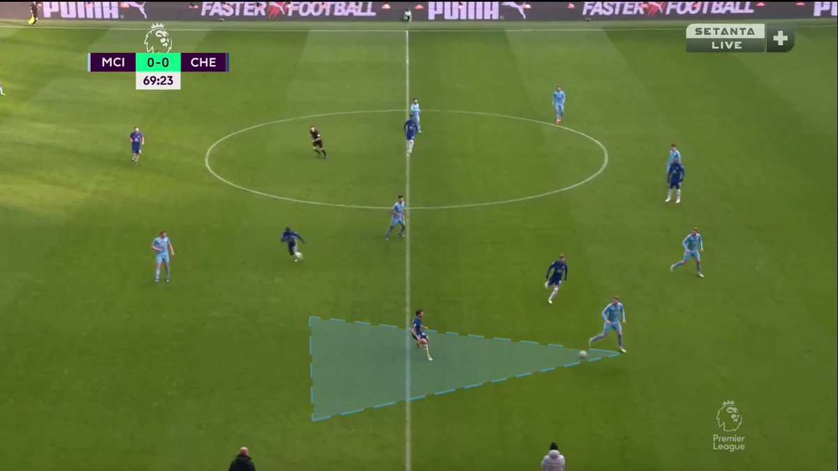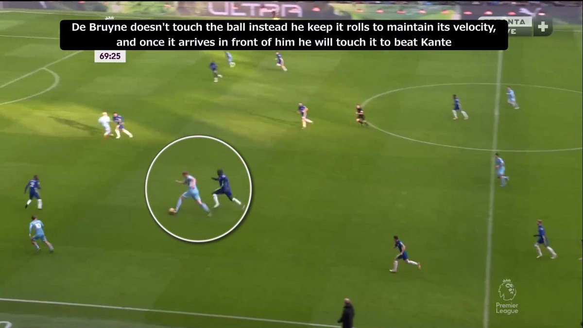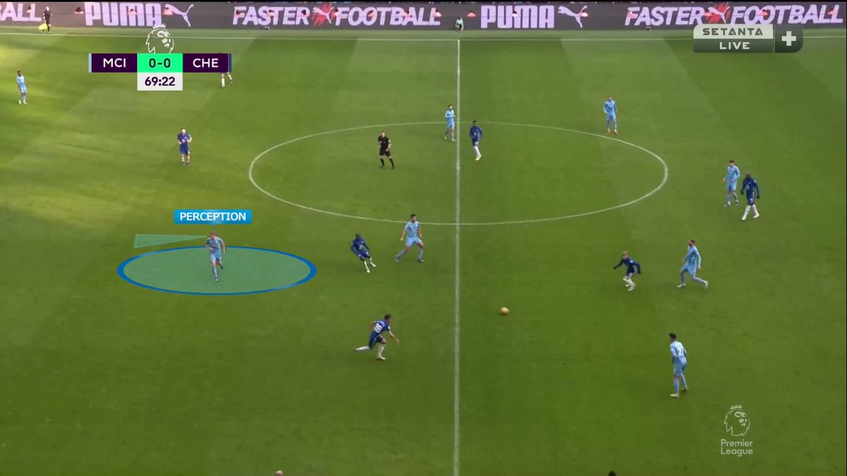 إيه احتمالية نجاح التمريرة الداخلية لدي بروينا وقتها؟ ضعيفة لأن إتجاهها هيكون داخلي "لقلب الملعب" مش خارجي بالتالي هتوصل في ضهر دي بروينا مش قدامه (على رجله الشمال مش اليمين) + كانتي هيكون عنده فرص اعلى في إعتراضها..