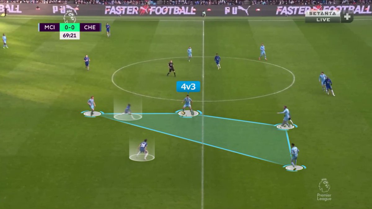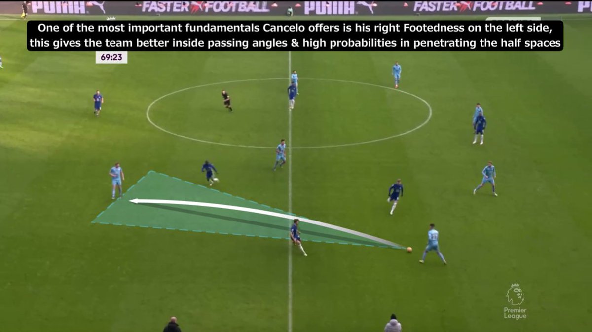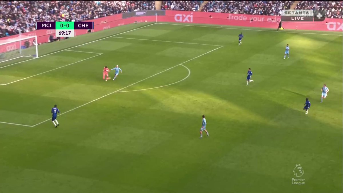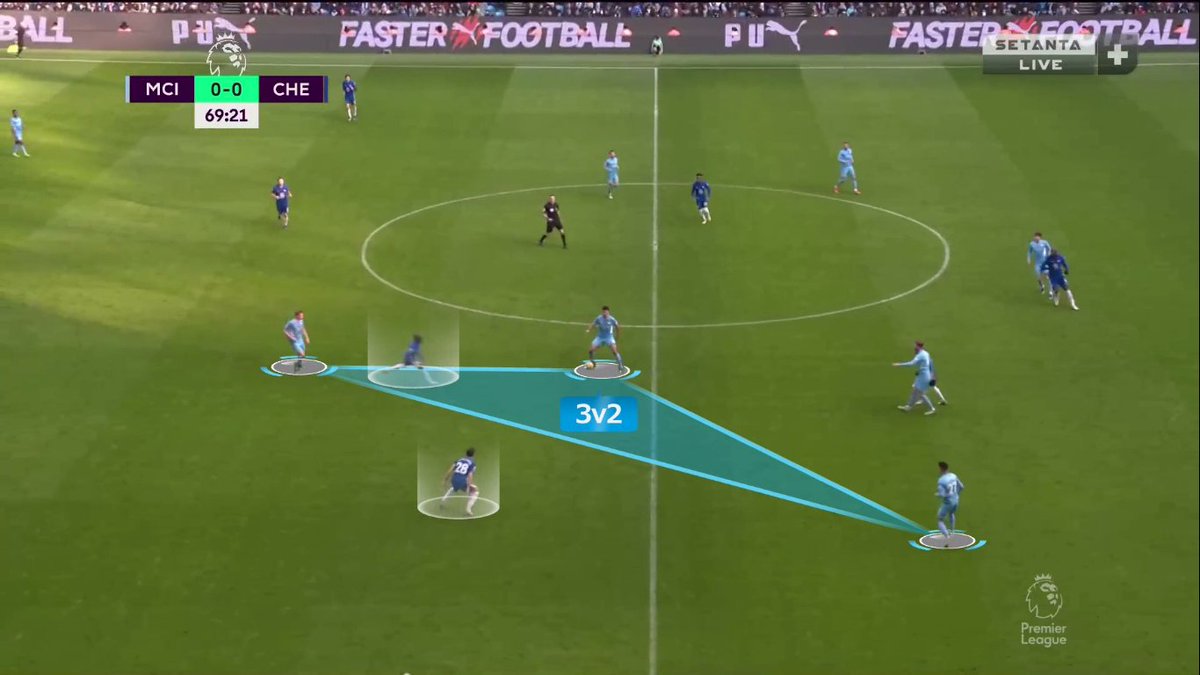 إيه احتمالية نجاح التمريرة الداخلية لدي بروينا وقتها؟ ضعيفة لأن إتجاهها هيكون داخلي "لقلب الملعب" مش خارجي بالتالي هتوصل في ضهر دي بروينا مش قدامه (على رجله الشمال مش اليمين) + كانتي هيكون عنده فرص اعلى في إعتراضها..