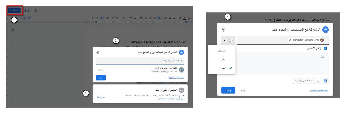1⃣ مشاركة الملفات مع أشخاص آخرين حيث تسمح لهم إما بالتحرير أو التعليق أو الاطلاع فقط من خلال إدخال عنوانهم البريدي كما يمكن نسخ رابط الملف ومشاركته مع آخرين