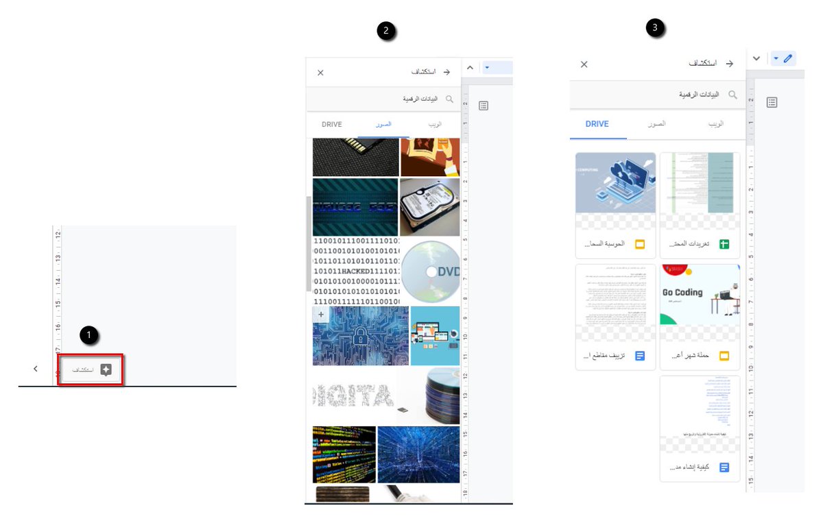 9⃣ شريط البحث المدمج داخل المستند بحيث يمكنك البحث بين ملفاتك الأخرى على Google Drive أو البحث على الانترنت أو بحث الصور حيث يمكنك سحبها وإفلاتها في المكان الذي تريده داخل المستند