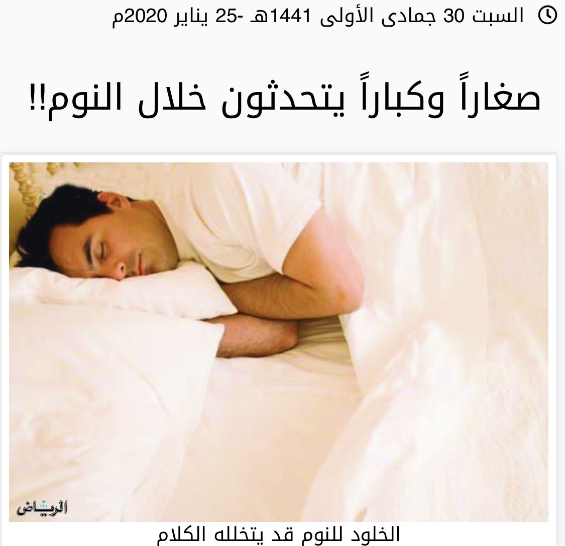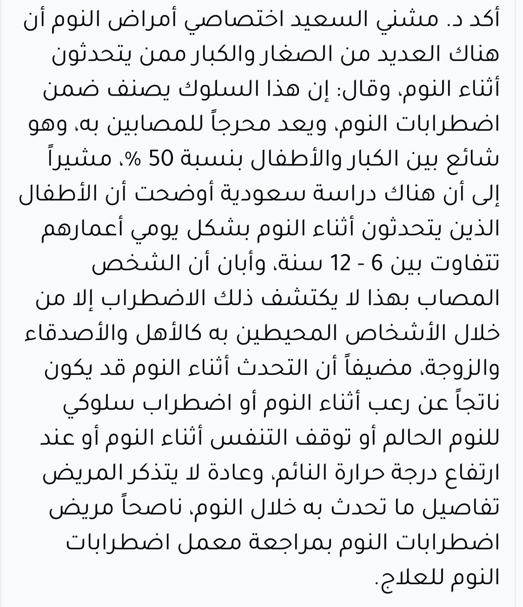 ٢- هناك العديد من الصغار والكبار ممن يتحدثون أثناء النوم، وقال: إن هذا السلوك يصنف ضمن اضطرابات #النوم، ويعد محرجاً للمصابين به، وهو شائع بين الكبار والأطفال بنسبة 50 % هناك دراسة سعودية أوضحت أن الأطفال الذين يتحدثون أثناء النوم بشكل يومي أعمارهم تتفاوت بين 6 - 12 سنة،