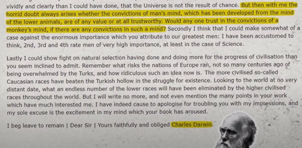 إنَّ القضية لا تنتهي هنا فالتطوُّر الحاصل للعقل حسب التطوريين لا يكسبه أيّة ميزة بل ينفي عنه كلياً أيّة قيمة متبقية فهو في نهاية المطاف لم يتطور لفك ألغاز الكون ففي النهاية كما يوضح ذلك التطوّري فرانسس كريك قائلاً: 🔻🔻🔻