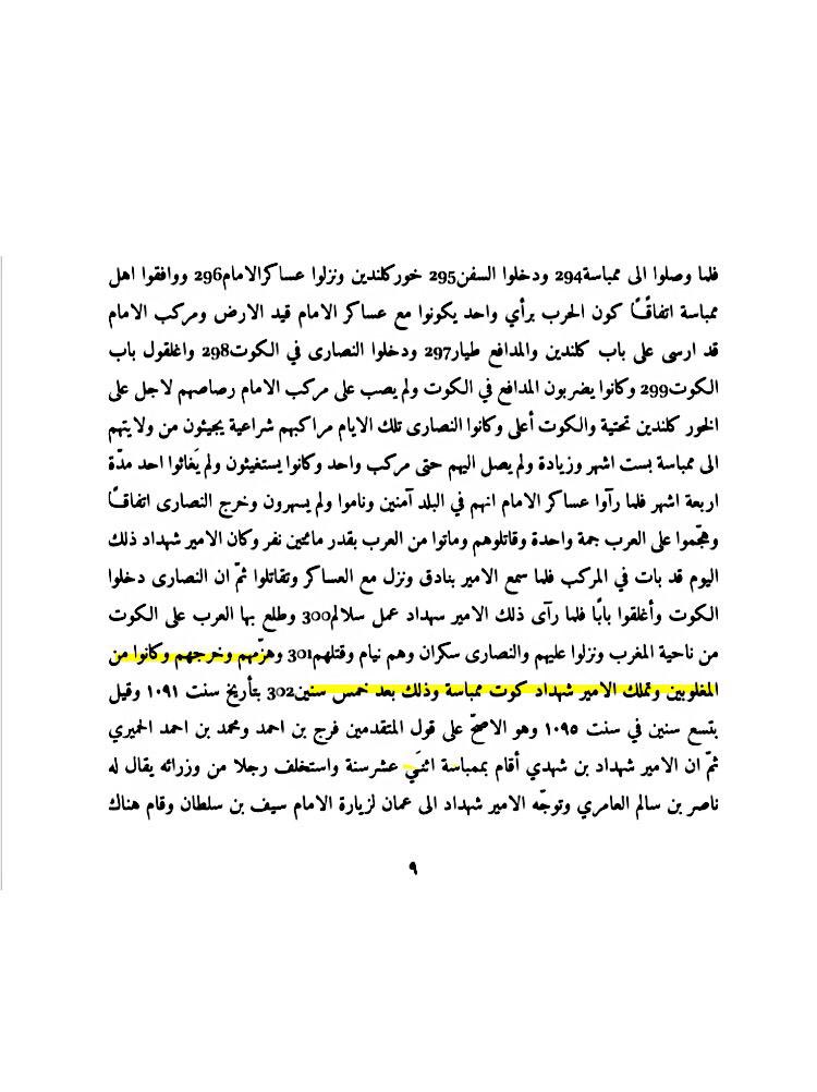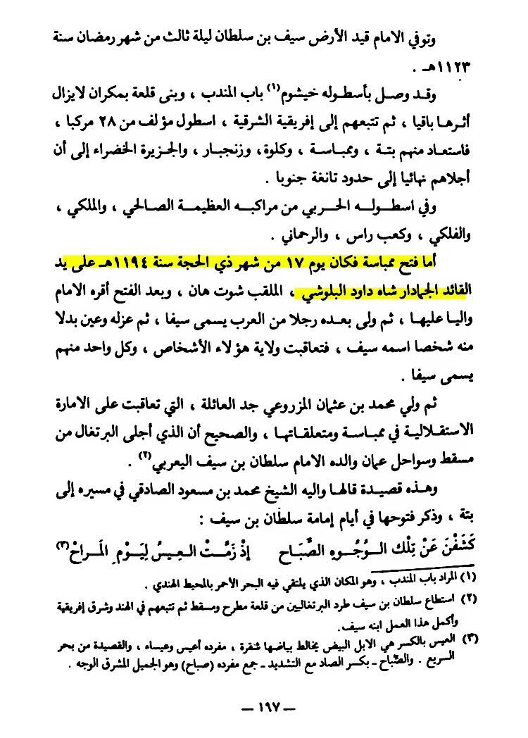 فتح ممباسا سنة 1194هــ / وهزيمة الجيوش الصليبية البرتغالية ، على يد قائد الجيوش العُمانيّة القائد الجمادار شهداد البلوشي - كما يسرد تلك الواقعة - الشيخ سعيد المغيري في كتابه - والباحثان جيمس ريتشي وسيقوارد سكارد في كتابهم ( المترجم للعربيّة ) .