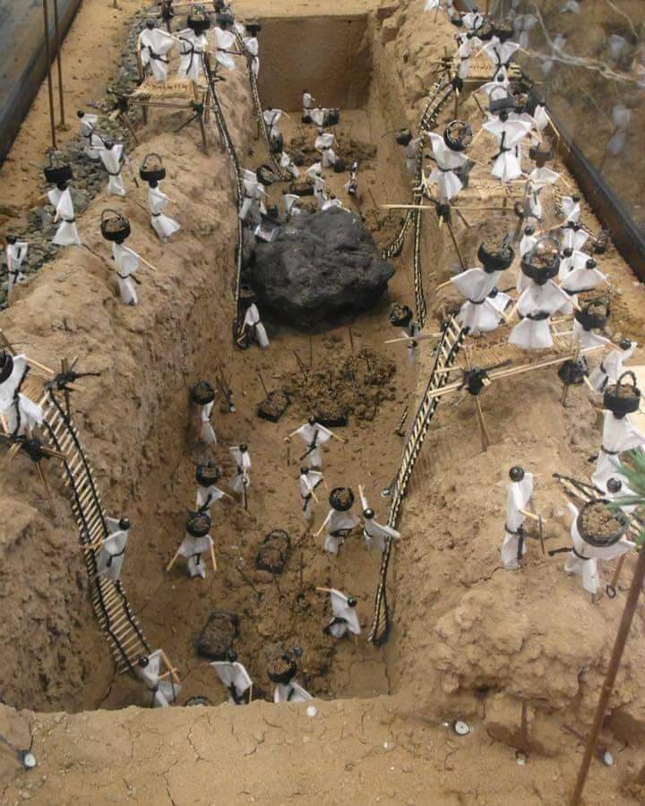 أنا نازل، ثم قـام وبطـنُه ﷺمعصوب بحجر من شِـدة الجـوع، وقد لبثنا ثلاثة أيام لا نذوق ذواقاً فأخذ النبي صلى الله عليه وسلم المعول، فضرب الصخرة فعادت كثيباً مهيلاً.