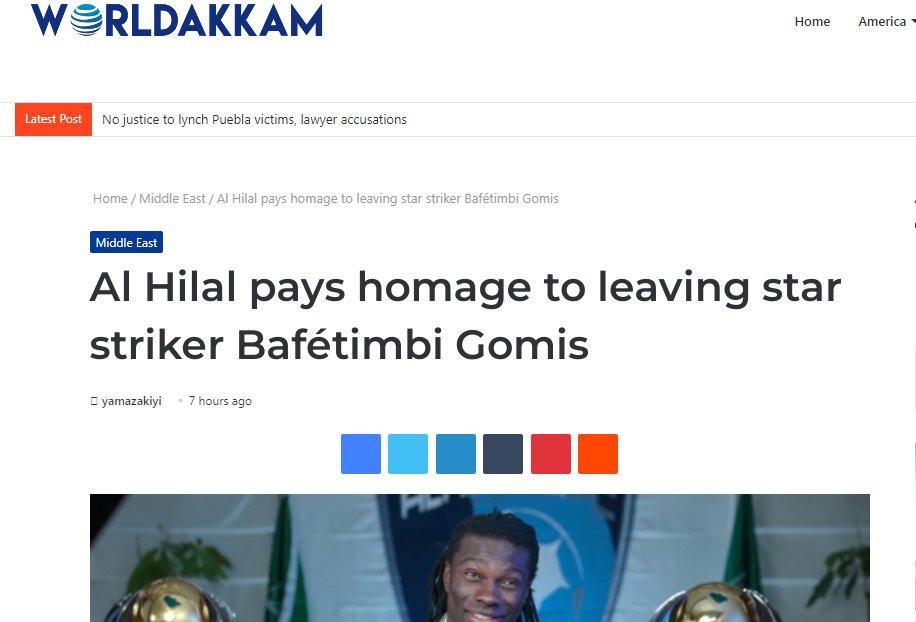 💥💥 البوابة الإخبارية العالمية "worldakkam": "#الهلال يقوم بتكريم رائع للمهاجم بافتيمبي غوميز. يغادر اللاعب بعد فترة عالية التتويج على مدار 3 سنوات ونصف. حضر غوميز للهلال في أغسطس 2018 من غلطة سراي وسجل 108 هدفًا في 150 مباراة وأصبح أحد أشهر اللاعبين في تاريخ النادي السعودي.