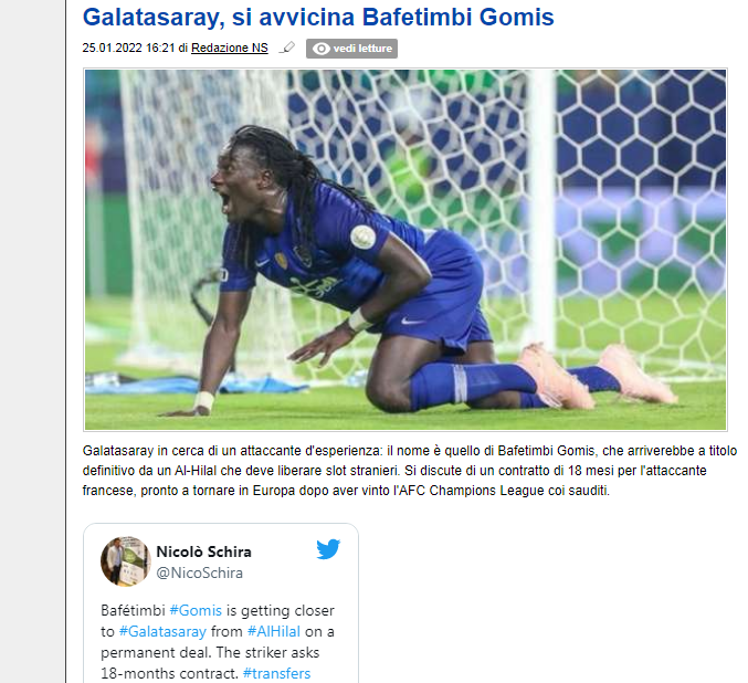 💥💥 الصحفي الإيطالي نيكولو شيرا عبر موقعه الرسمي: "غلطة سراي يقترب من بافيتيمبي جوميز.. الفريق التركي يبحث عن مهاجم متمرس. تجري المناقشة مع لاعب #الهلال السابق على عقد لمدة عام ونصف. غوميز على استعداد للعودة إلى أوروبا بعد فوزه بدوري أبطال آسيا مرتين".