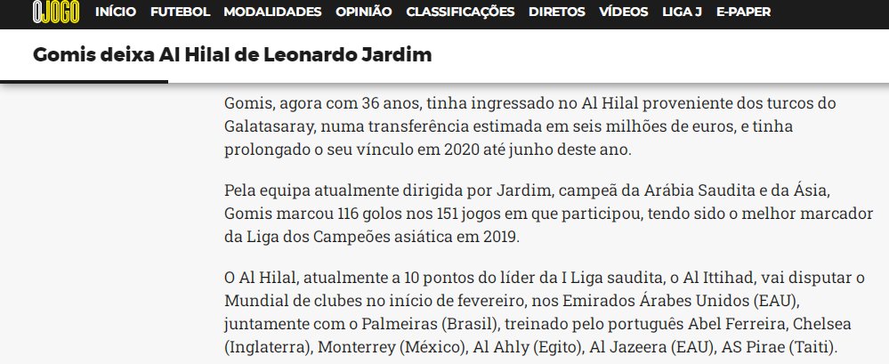 💥💥 صحيفة "ojogo" البرتغالية: "جوميز يرحل عن فريق المدرب ليوناردو جارديم. أحرز اللاعب مع #الهلال 116 هدفًا في 151 مباراة وكان هداف دوري أبطال آسيا عام 2019. الهلال تنتظره مشاركة قوية في كأس العالم للأندية مطلع فبراير إلى جانب بالميراس وتشيلسي ومونتيري والأهلي والجزيرة وبيراي".