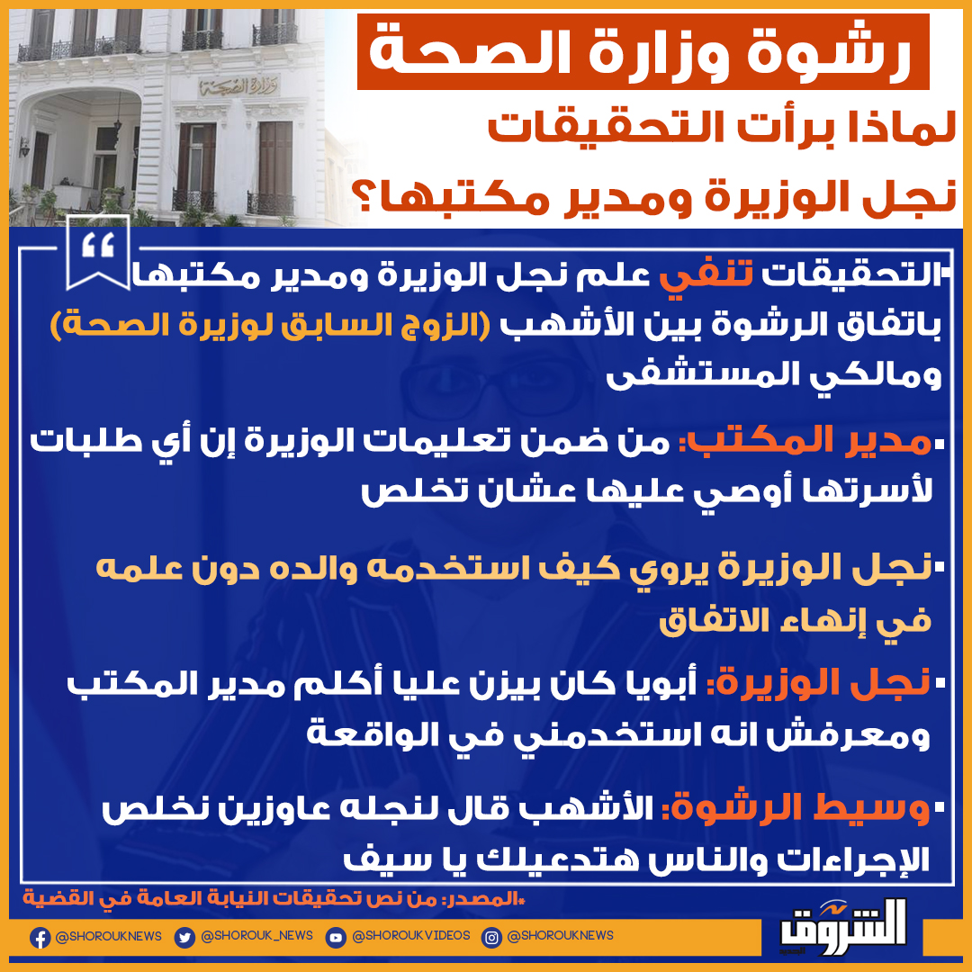 - التحقيقات تنفي علم نجل الوزيرة ومدير مكتبها باتفاق الرشوة بين الأشهب (الزوج السابق لوزيرة الصحة) ومالكي المستشفى