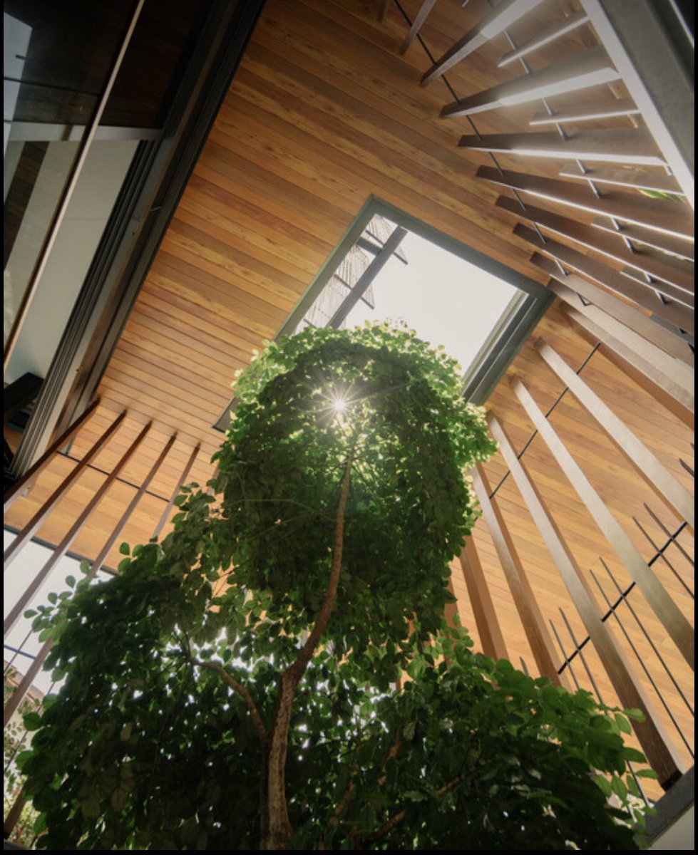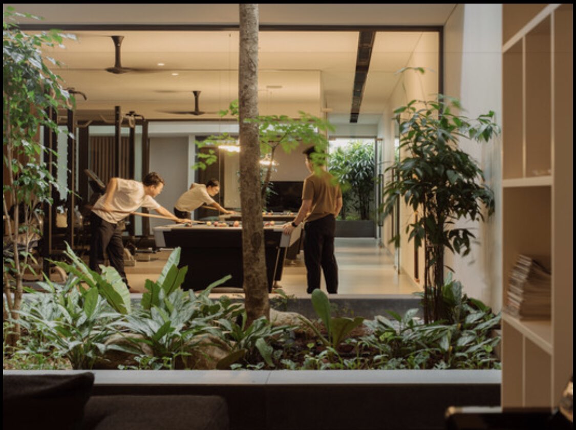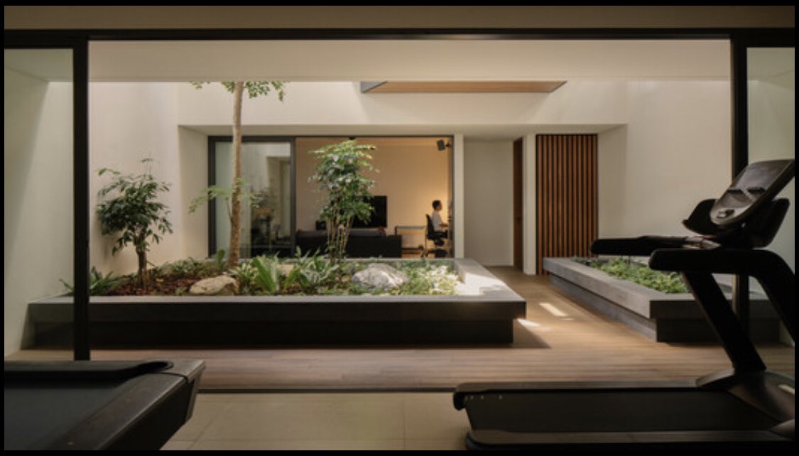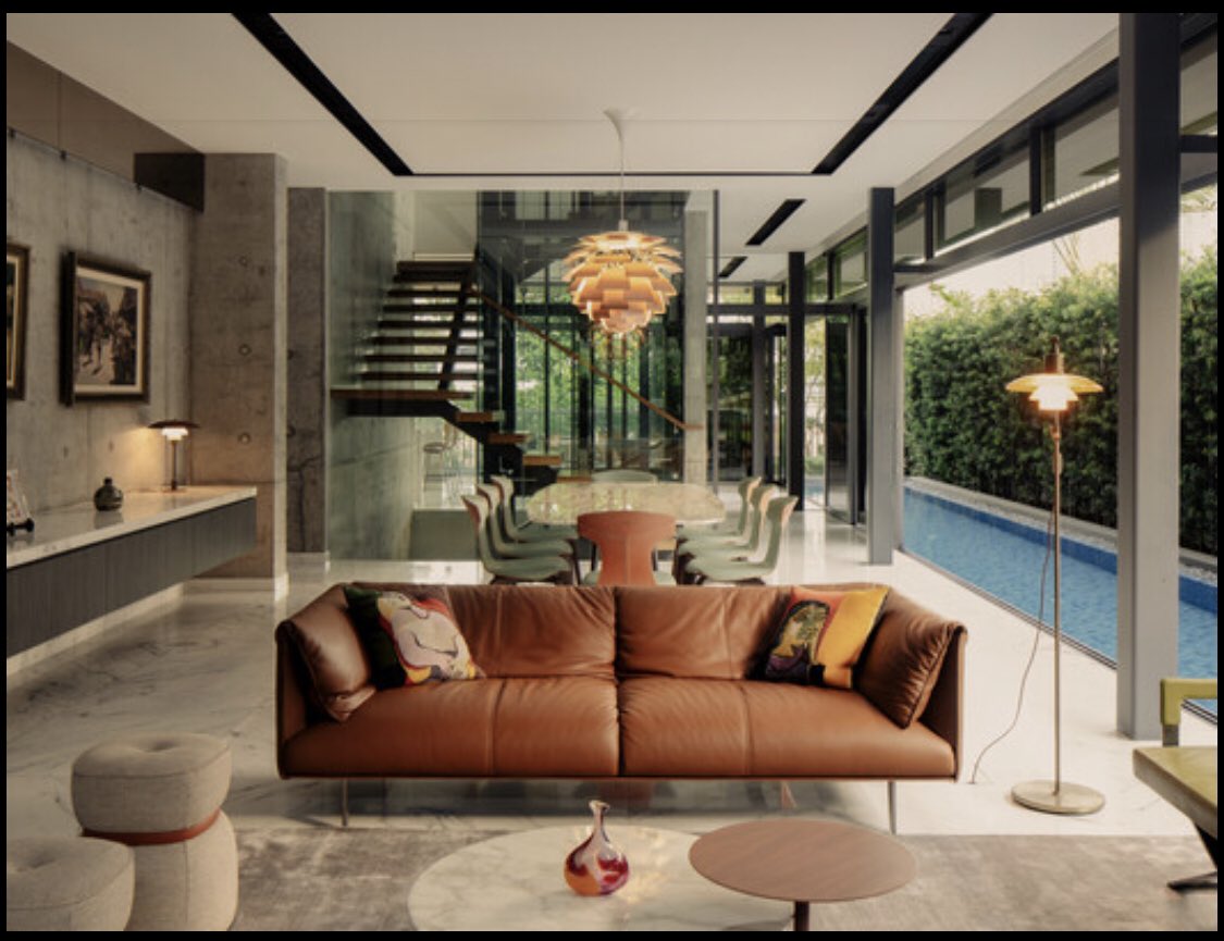 نجد ايضاً اهتمام المصمم باطلالات الفراغات المهمه والرئيسية بالفيلا مثل المعيشة والتي يقضي فيها المستخدم مجمل ساعاته بها وتجتمع بها العائلة وذلك بتصميم المسبح الخارجي عالارتداد بشكل طولي على امتداد واجهة المعيشة .