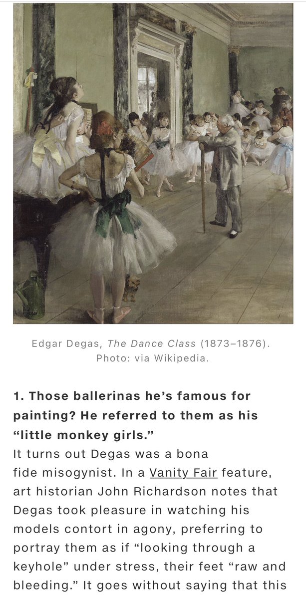 اشتهر الرسام الفرنسي ادغار ديغا بلوحات راقصات الباليه في باريس منتصف القرن ١٨. ومع ذلك عُرف عن الرسام عاشق الباليه والرقص اللطيف، أنه كاره للنساء وينظر لهم كحيوانات ويستمتع برؤية بؤس حياة الباليرينات الذين كانوا مستعبدين حرفيا، و يصفهم بـ: القردة الصغار🙊. وكان معادي للسامية أيضا