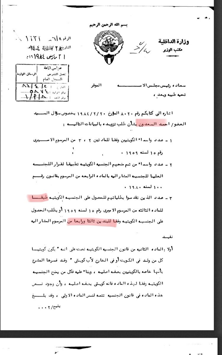 وثيقة تحتوي على الرد على سؤال احمد السعدون عن مقدمي الطلبات من #البدون عام 1984 وفقا للبندين الثالث و الرابع و المادة الأولى..