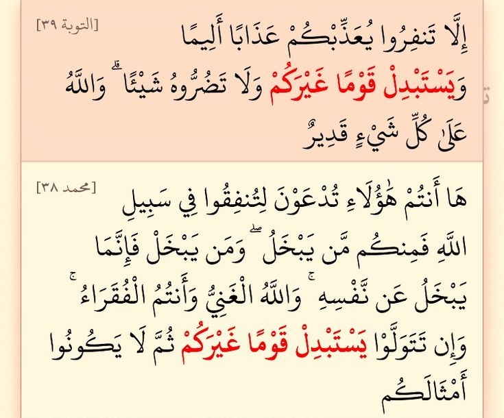 فالمسلم لا يخاف ضياع الإسلام؛ بل يخاف ضياع نفسه إن تولّى؛ فماتوا من هم خير منّا ولم ينتهِ الإسلام؛ المسلم يخاف إن تولّى أن يستبدله الله بمن هو خير منه ويخضعوكم مجدّدًا كما أخضعوكم أجدادنا.