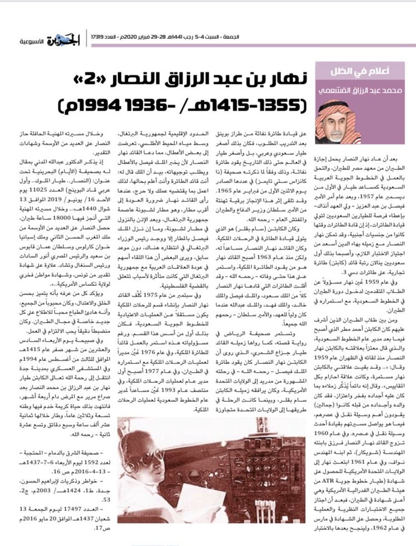 1️⃣قصتنا السابعة والأربعون عن أصغر طيار في العالم يقود طائرة نفاثة، وأول قائد طائرة (كابتن) سعودي يجري رحلة بالطائرة حول العالم، تميز بحسن الخلق، والإعتدال، وبمحبة الناس له، وكان محباً للقراءة والإطلاع، بطل قصتنا المتميز بلقب طيار الملوك، إنه الكابتن #نهار_النصار رحمه الله