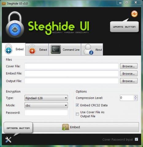 الآن، لدى Steghide UI لوحة خيارات جديدة.
