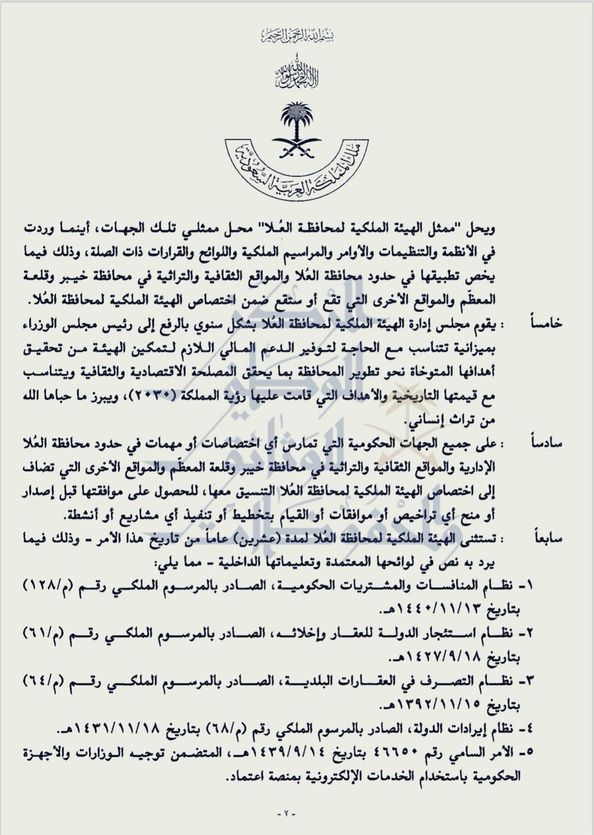 4/ وفي المثال أعلاه، تم الاستثناء بموجب أداة أسمى وليس بذات الأداة، فالأنظمة التي تم استثناء "الهيئة الملكية لمحافظة العلا" منها هي أنظمة صادرة بمرسوم ملكي، والاستثناء جاء بأمر ملكي، وهو أقوى الأدوات التنظيمية على الإطلاق، وهذا تطبيق لمبدأ المشروعية ومراعاة للتدرج الهرمي للتشريع.
