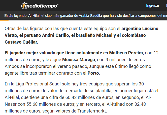 💥💥 صحيفة "mediotiempo" المكسيكية تسلط الضوء على نادي #الهلال قبل مشاركته في كأس العالم للأندية: "3 فرق سعودية فقط تتجاوز قيمتها السوقية 30 مليون يورو، الهلال أولا بـ 60.43 مليون يورو وفي المرتبة الثانية النصر بـ 55.68 مليون يورو وفي المرتبة الثالثة الاتحاد بـ 32.48 مليون يورو".